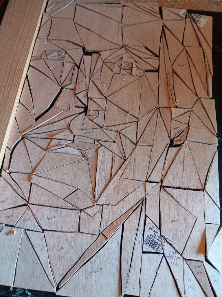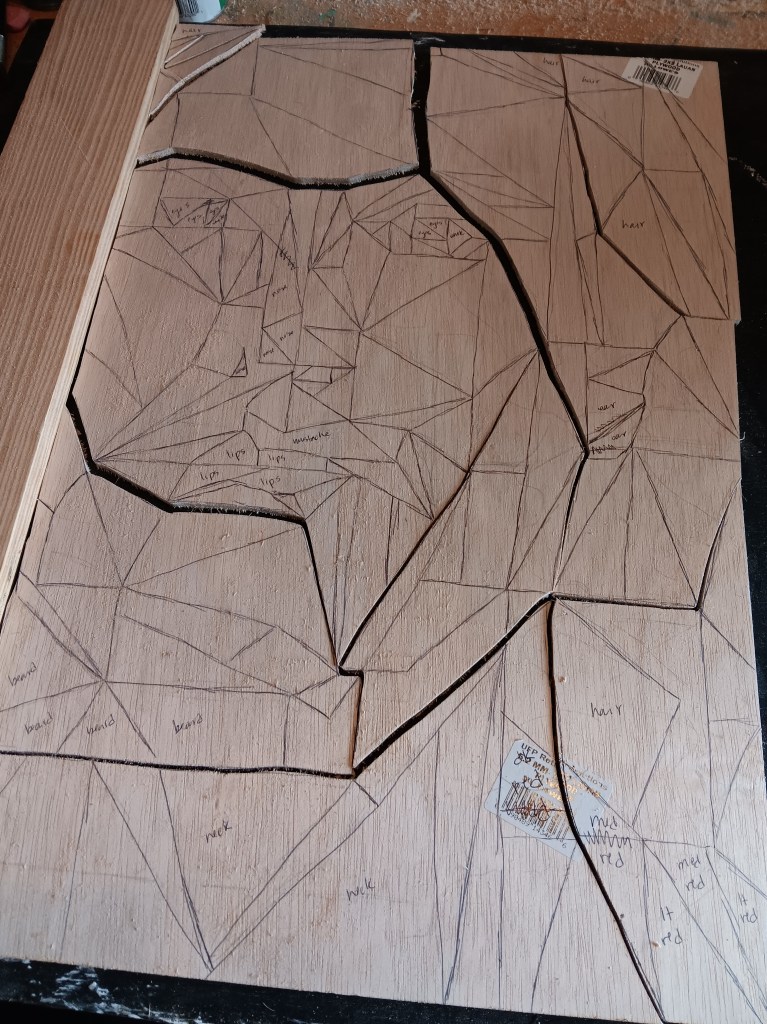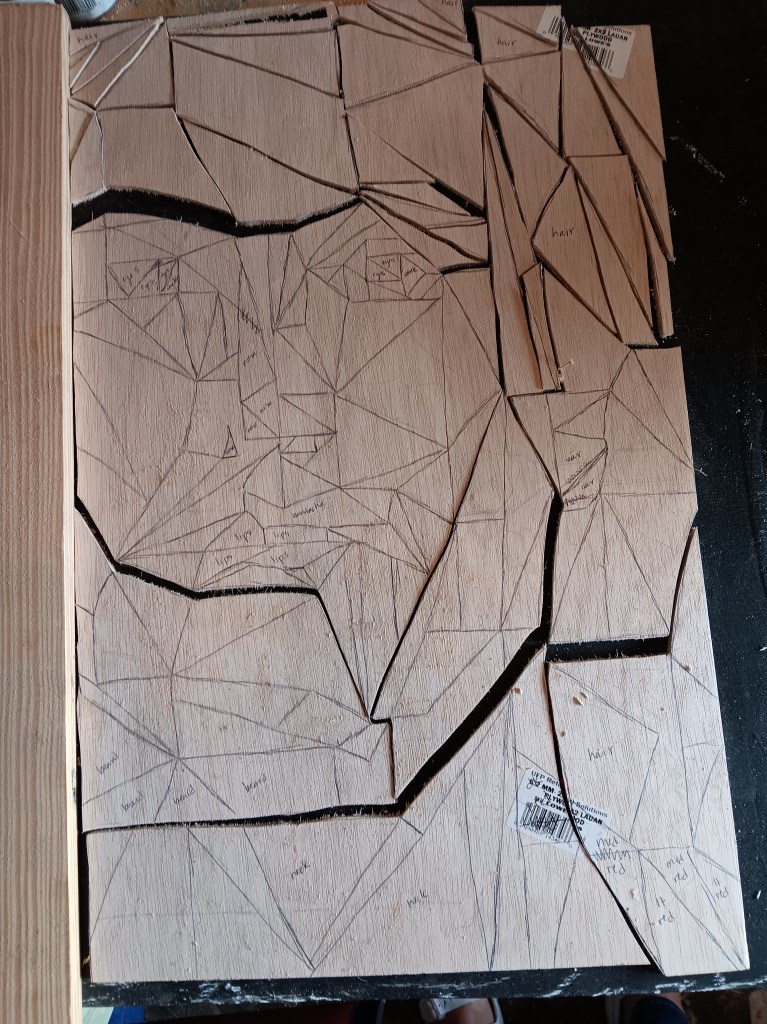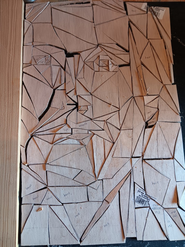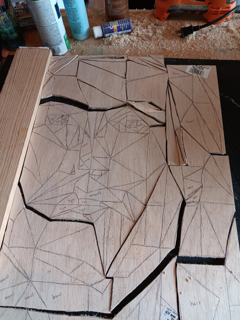 Then I took the wood to my scroll saw and cut it into smaller pieces so it would be easier to work with. The cut image is 24 x 16 inches.