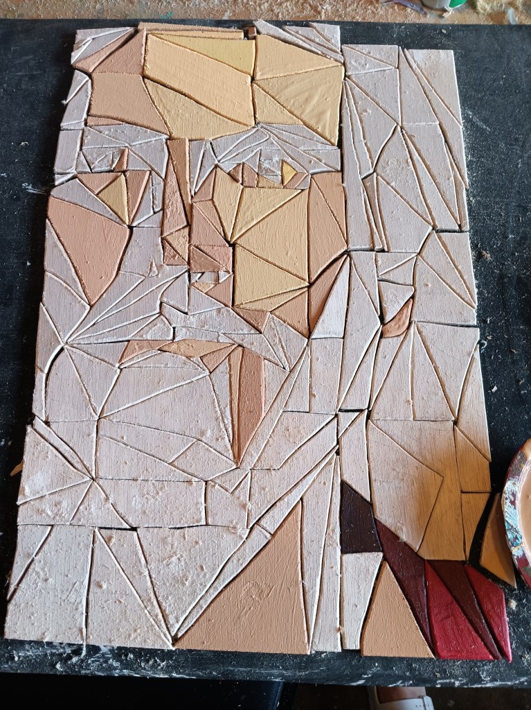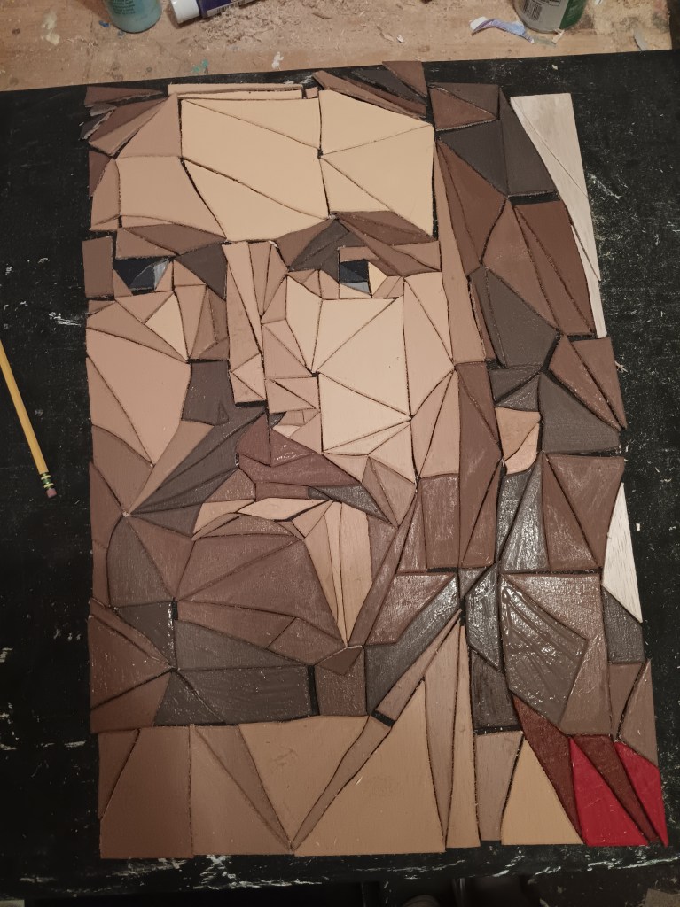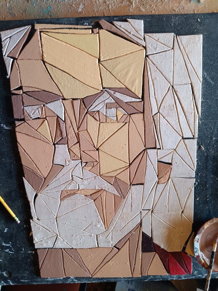 Then came the fun/hard part: painting all of the dozens of variations in skin color. I got a lot of questions on what colors of paint I used. Honestly, I had a lot of light orange left over from another project, so I started with that. I added some brown and white to it to make it look more like skin, and then I started with the very lightest tone on the face – the forehead. Following the original image VERY closely (I chose to have it on my phone so I could zoom in easily), I would add a dot of red for the next tone, make sure I painted every single piece that matched that color, then add a dot of brown and do the same thing.