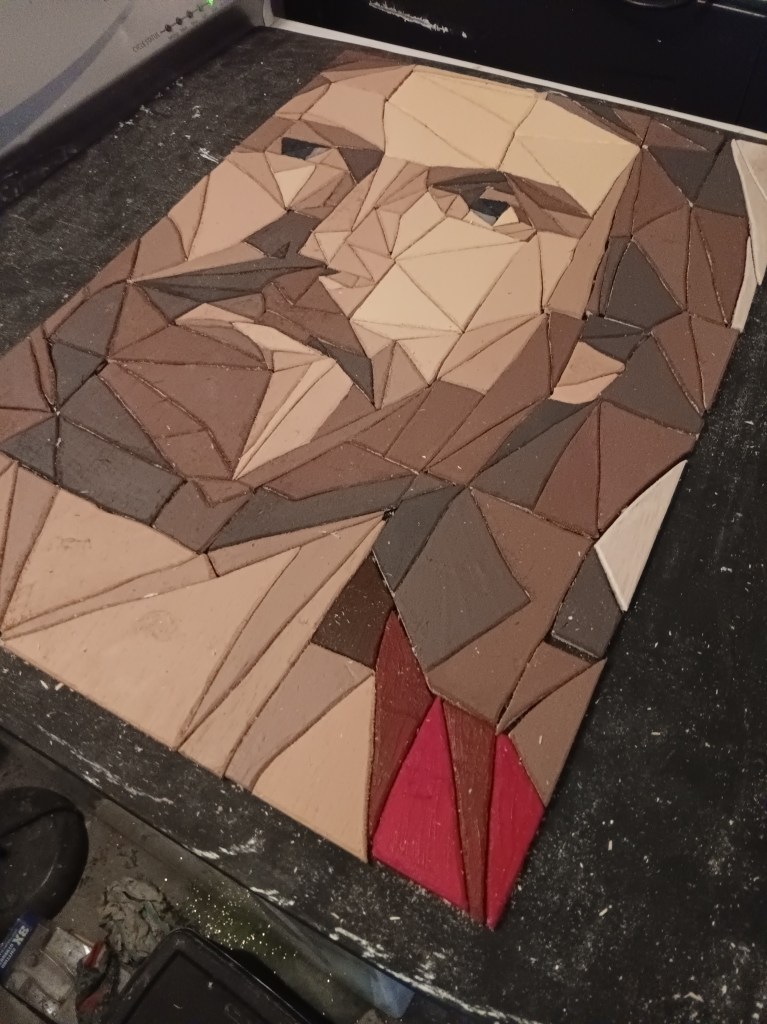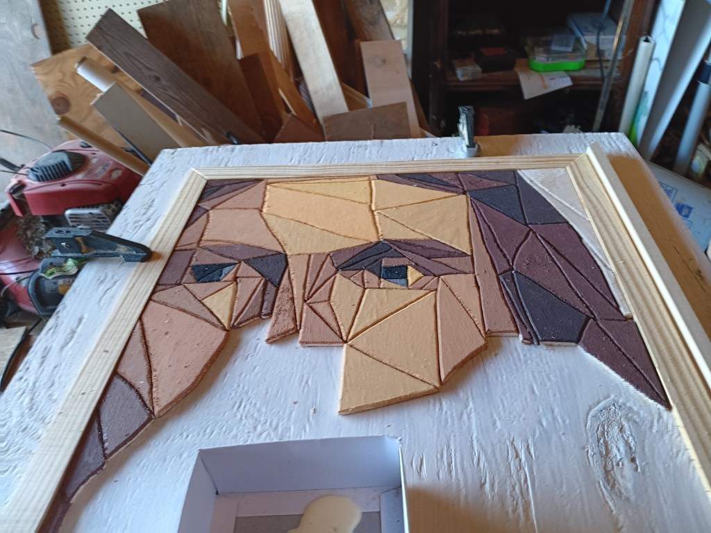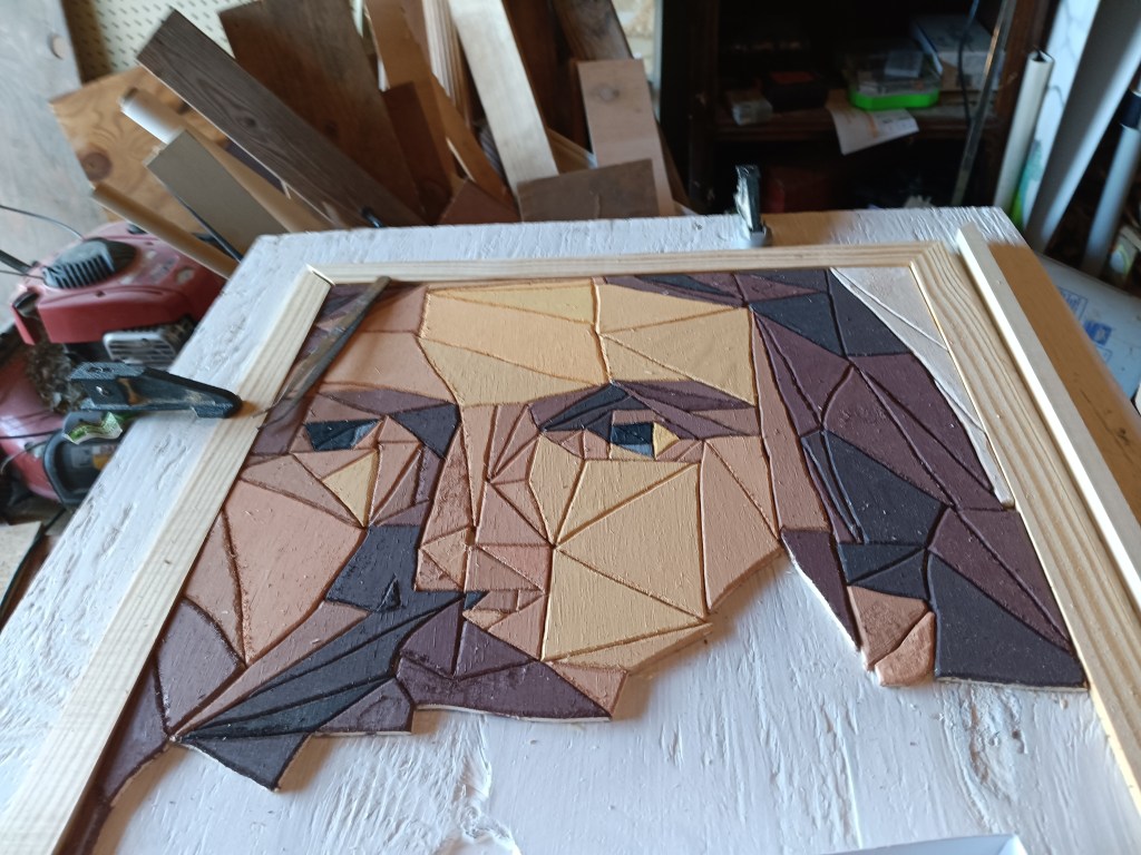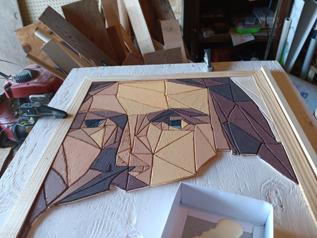 Then came time to decide on what colors to stain the frame. I got on a Facebook woodworking group to ask for suggestions. So many people were very kind and complimentary. A few offered to buy it, others asked for the pattern. And as I expected, some chose to make fun of the subject I chose to portray.
