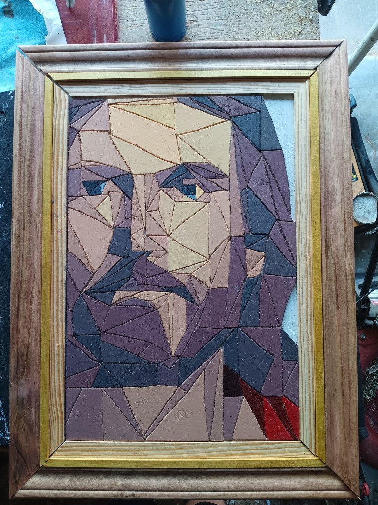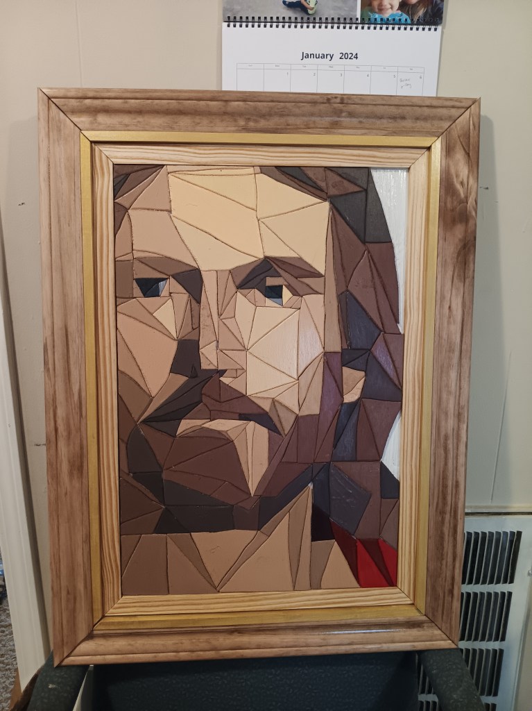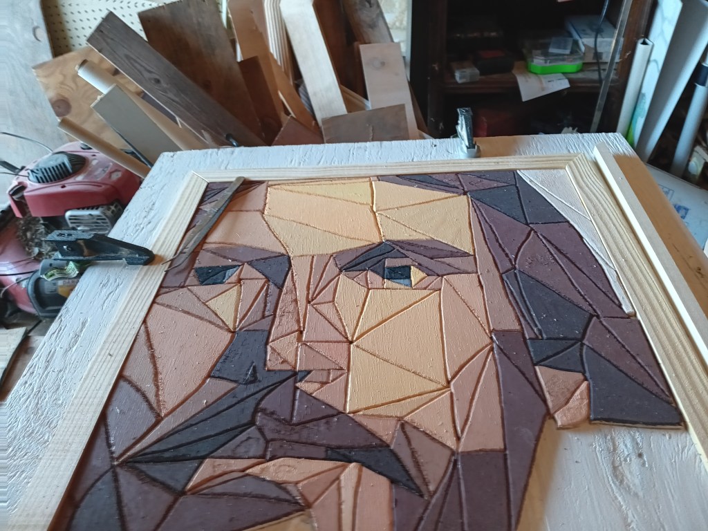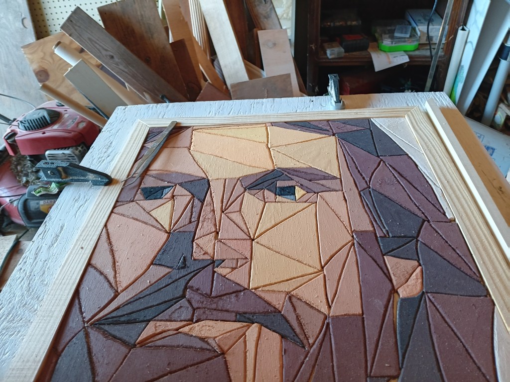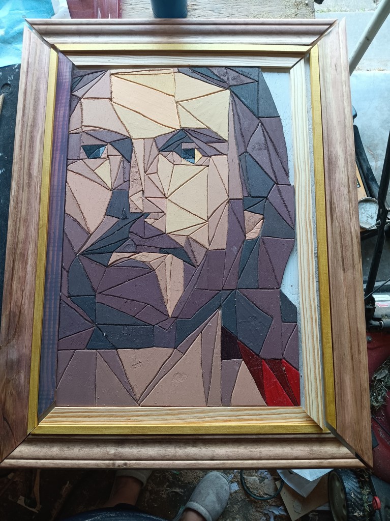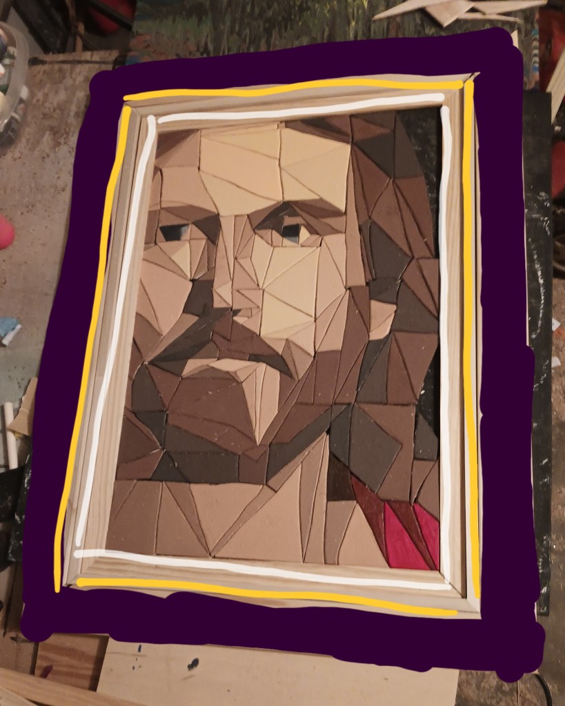 I knew it needed a special frame worthy of the subject it depicted. So I tried an idea I had seen on another artist’s page – a 3-tiered frame. I was extremely picky with the thickness and height of woods I was using. I spent a solid hour at Lowe’s looking at options. For the innermost part I actually used a table saw for the first time so that I could get the thickness I wanted.