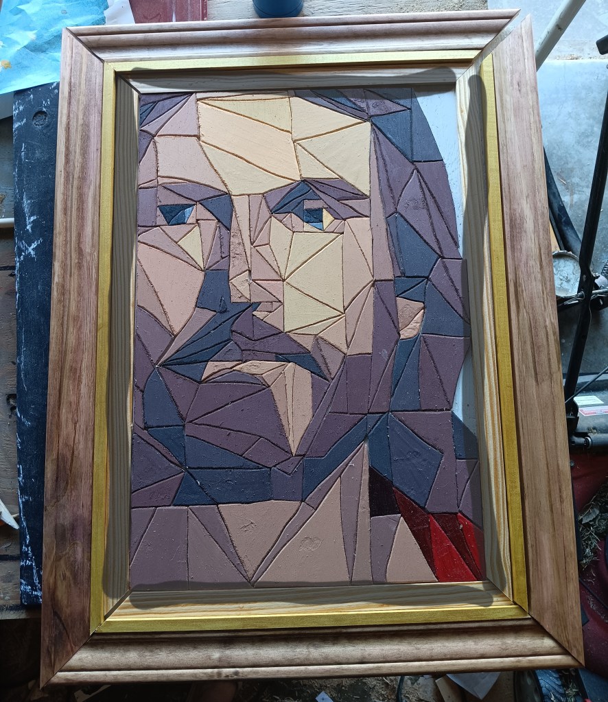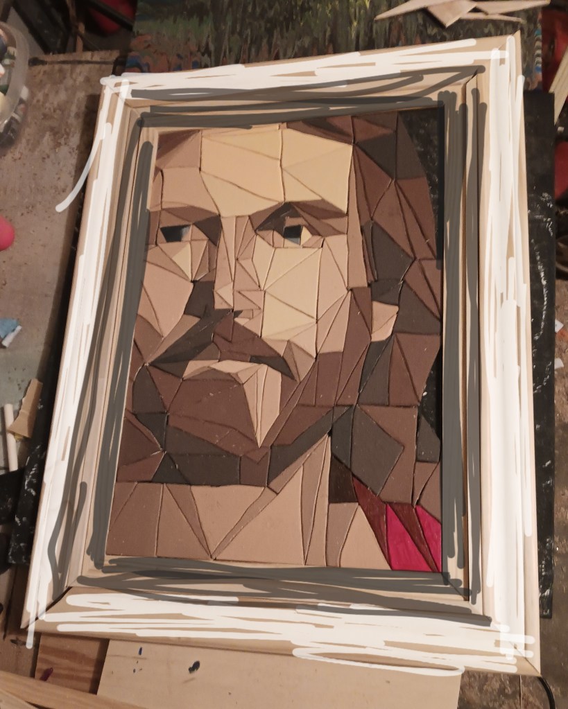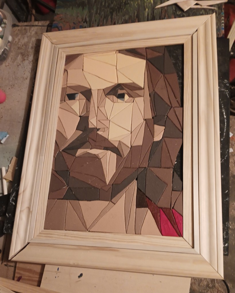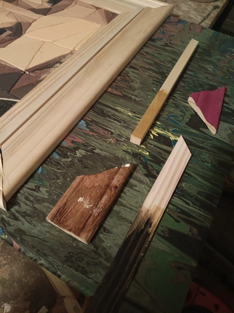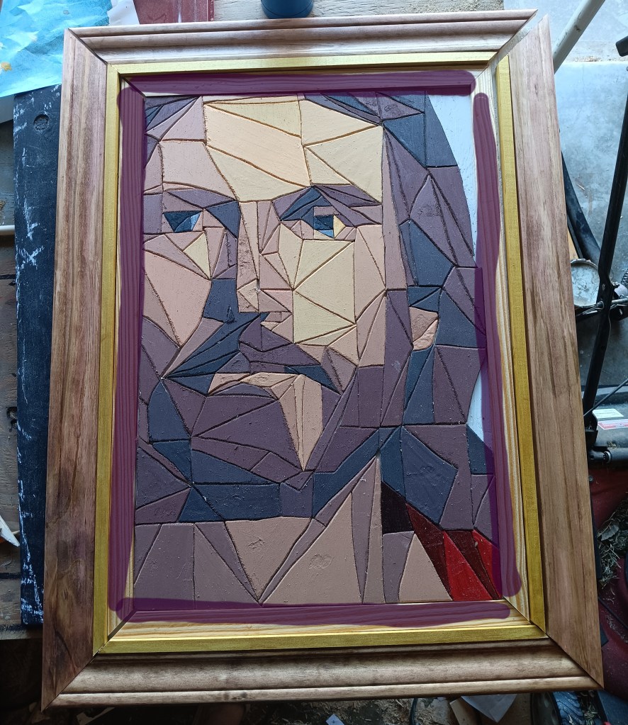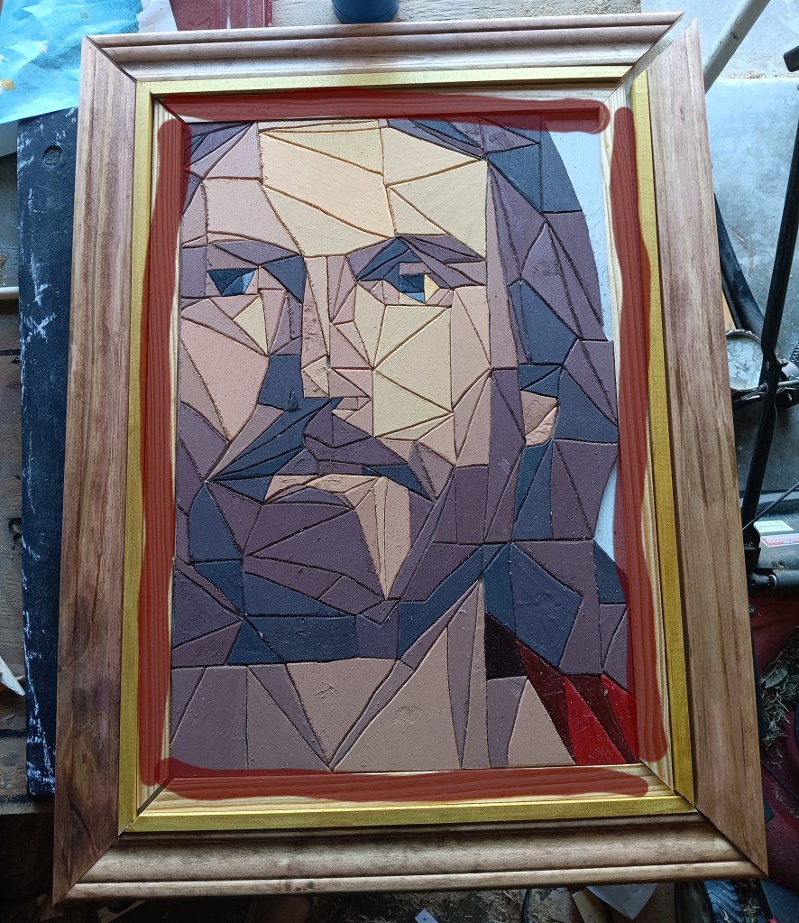 I knew it needed a special frame worthy of the subject it depicted. So I tried an idea I had seen on another artist’s page – a 3-tiered frame. I was extremely picky with the thickness and height of woods I was using. I spent a solid hour at Lowe’s looking at options. For the innermost part I actually used a table saw for the first time so that I could get the thickness I wanted.