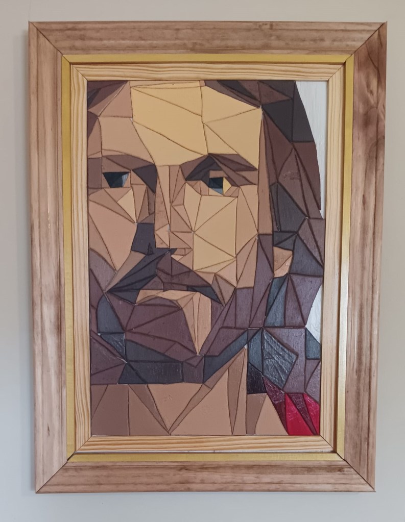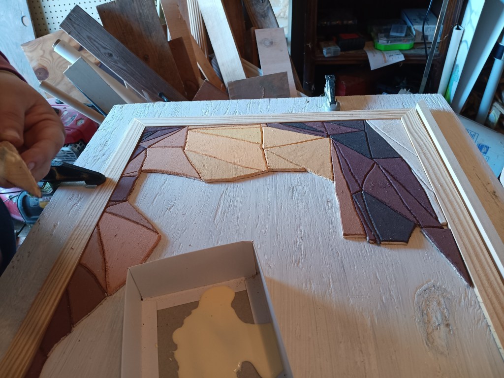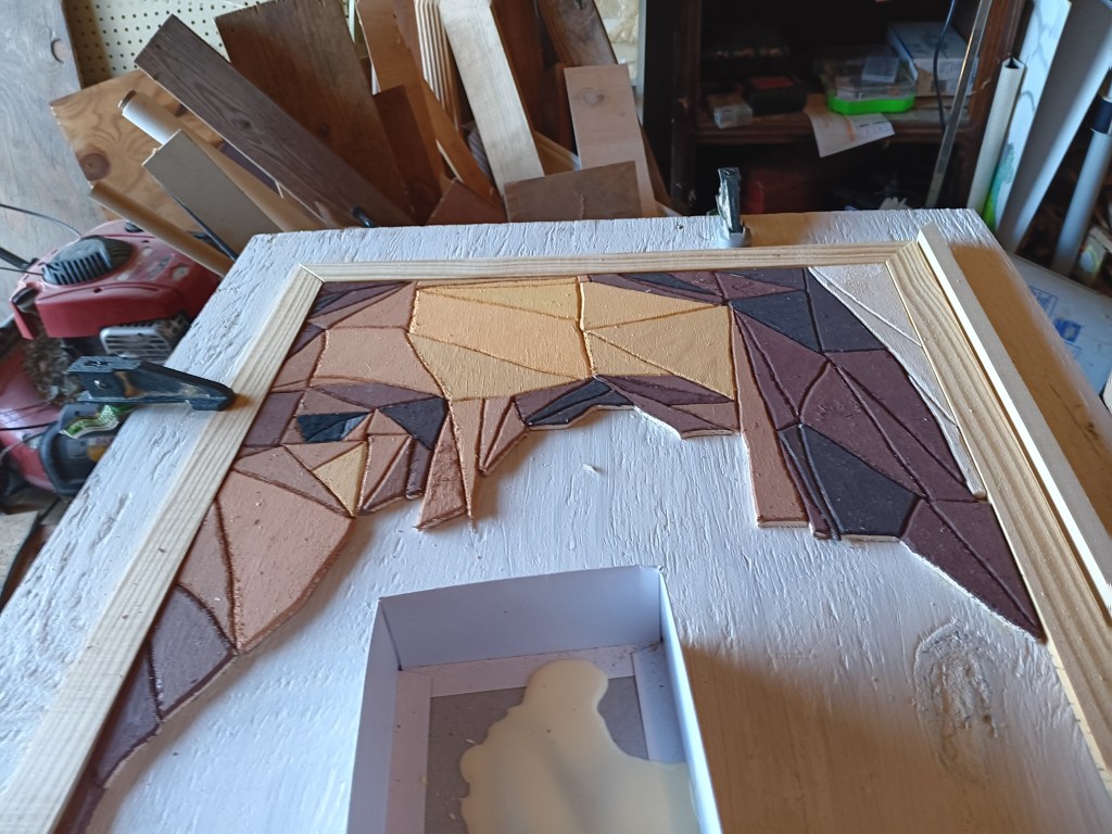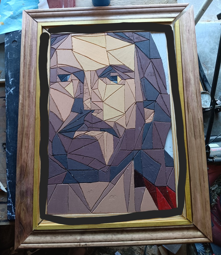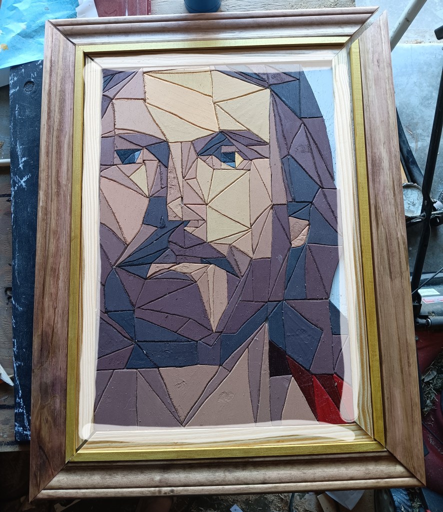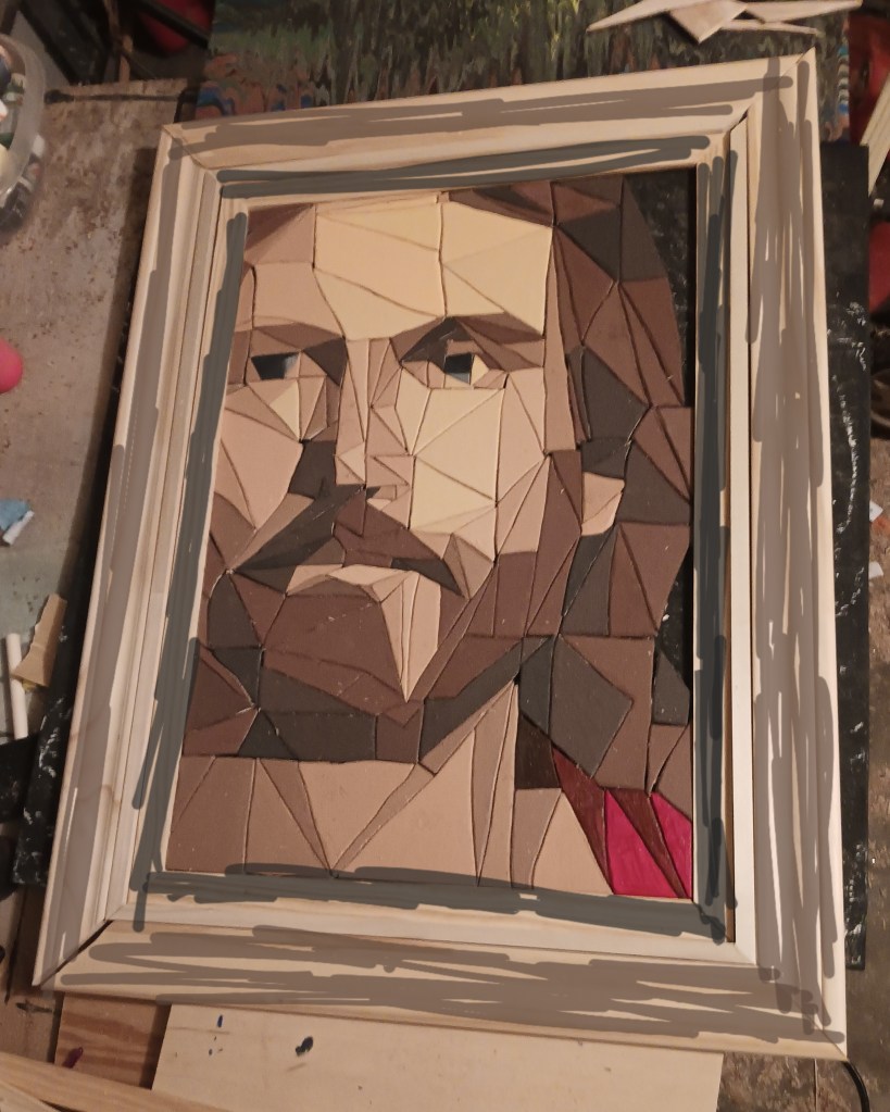 I knew it needed a special frame worthy of the subject it depicted. So I tried an idea I had seen on another artist’s page – a 3-tiered frame. I was extremely picky with the thickness and height of woods I was using. I spent a solid hour at Lowe’s looking at options. For the innermost part I actually used a table saw for the first time so that I could get the thickness I wanted.
